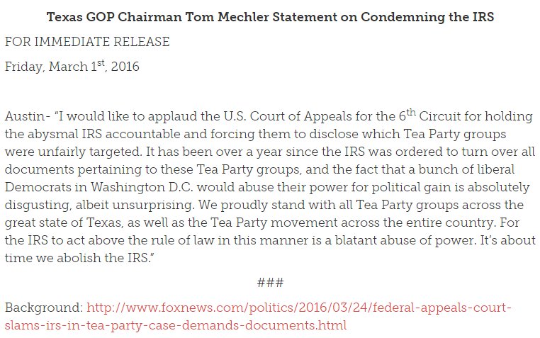See Chairman @tommechler's statement on condemning the IRS here: https://www.texasgop.org/texas-gop-chairman-tom-mechler-statement-on-condemning-the-irs/ …pic.twitter.com/xzLNwiSUeB