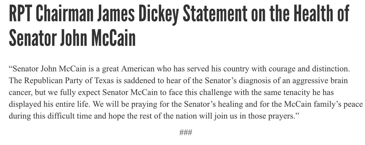 See RPT Chairman @jamesdickey's statement on the health of @SenJohnMcCain here: https://www.texasgop.org/rpt-chairman-james-dickey-statement-on-the-health-of-senator-john-mccain/ …pic.twitter.com/8BLnRyB7iO