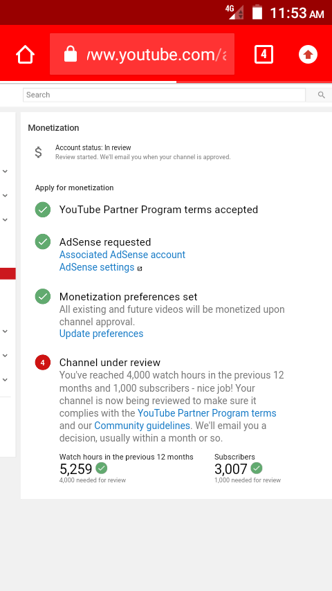 My Channel is completed 1k subscribers and 4k watch hours in previous 365 days but my Channel is still under review.