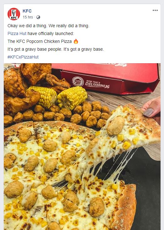 KFC and Pizza Hut in the UK made a popcorn chicken pizza and also it's got actual corn on it for some reason https://www.facebook.com/KFC.uk/photos/a.177995872646/10156877317937647/?type=3 …pic.twitter.com/iyfB53oHbc