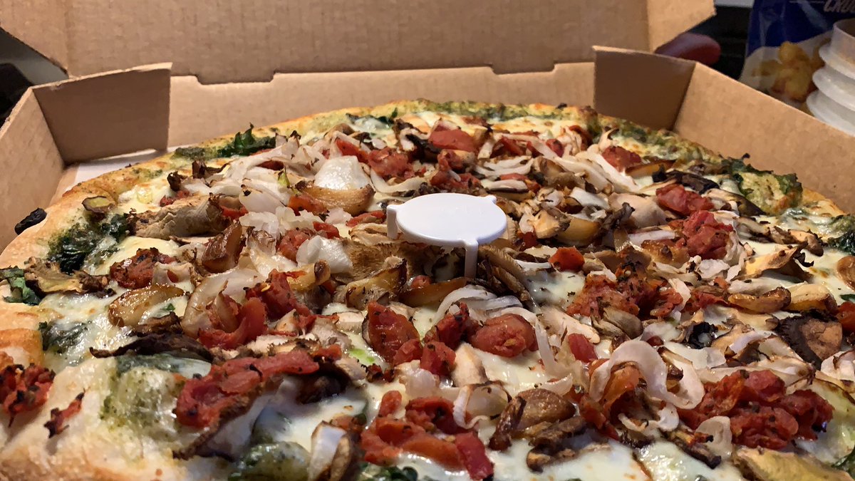 ...spinach, white onion, spicy stewed tomatoes, whole garlic, shiitake mushrooms, pesto sauce. Are you not entertained.pic.twitter.com/kftppwIsdr