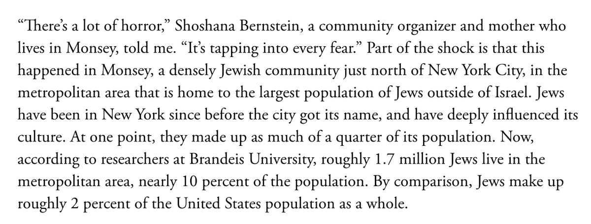 In Monsey, of all places, "Jews should feel safe," writes Emma Green. But "Jews are being targeted for violence, whether they live in the heart of Brooklyn or the suburbs of Rockland County." http://on.theatln.tc/IXoho5k pic.twitter.com/MnXbDAT6aB