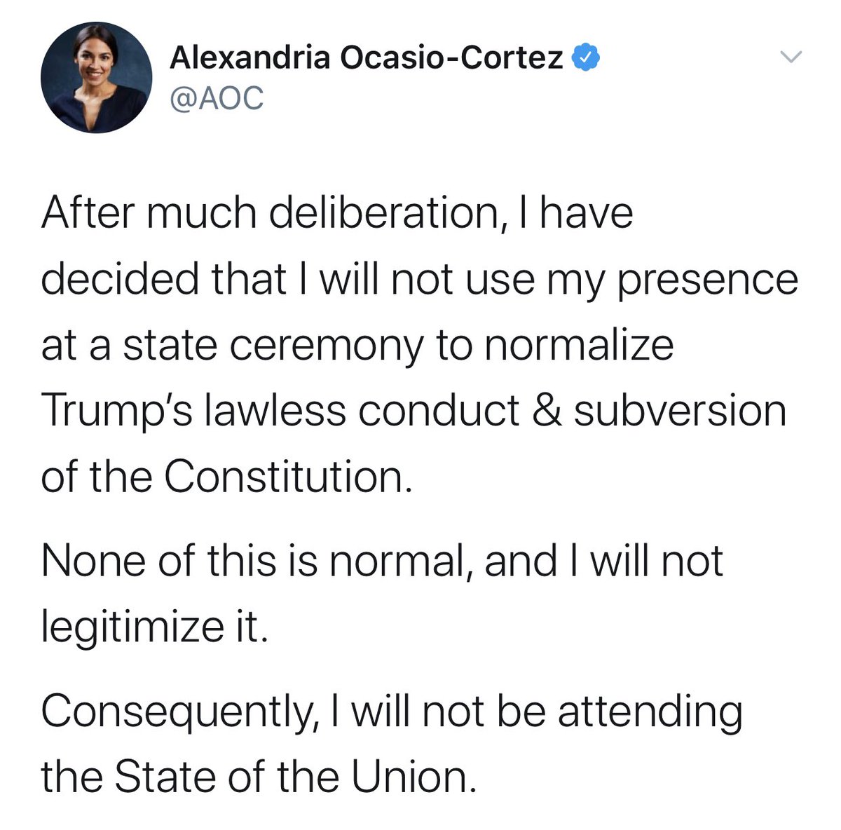 — NEW: New York Rep. Alexandria Ocasio-Cortez tweets that she will be boycotting tonight's State Of TheUnion speech.pic.twitter.com/5B6Tafd8wy
