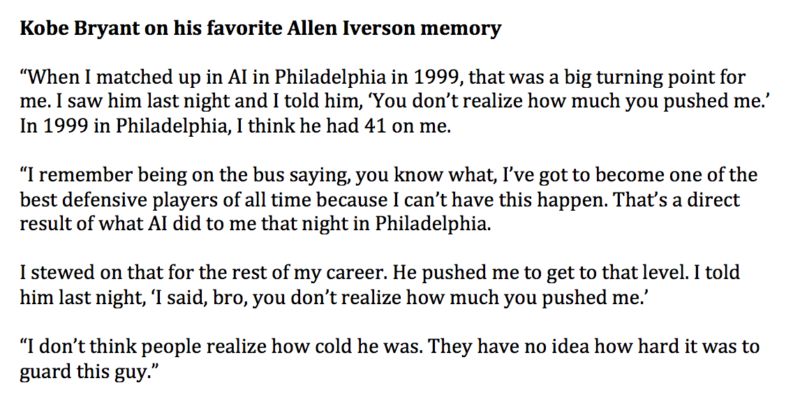 Lakers' Kobe Bryant told me his favorite Allen Iverson memory, this 1999 game: http://bit.ly/1myV306 pic.twitter.com/rIY7v6bsu2