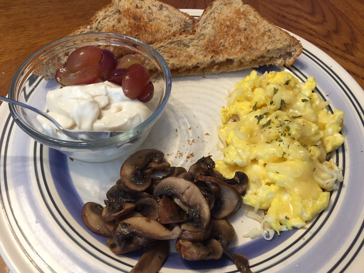 When you watch gourmet cooking shows... Scrambled eggs with Monterey jack cheese and parsley flakes, baby bella mushrooms sautéed in butter, honey yogurt with grapes, and whole grain toast with pumpkin butter.pic.twitter.com/cvusyT374N