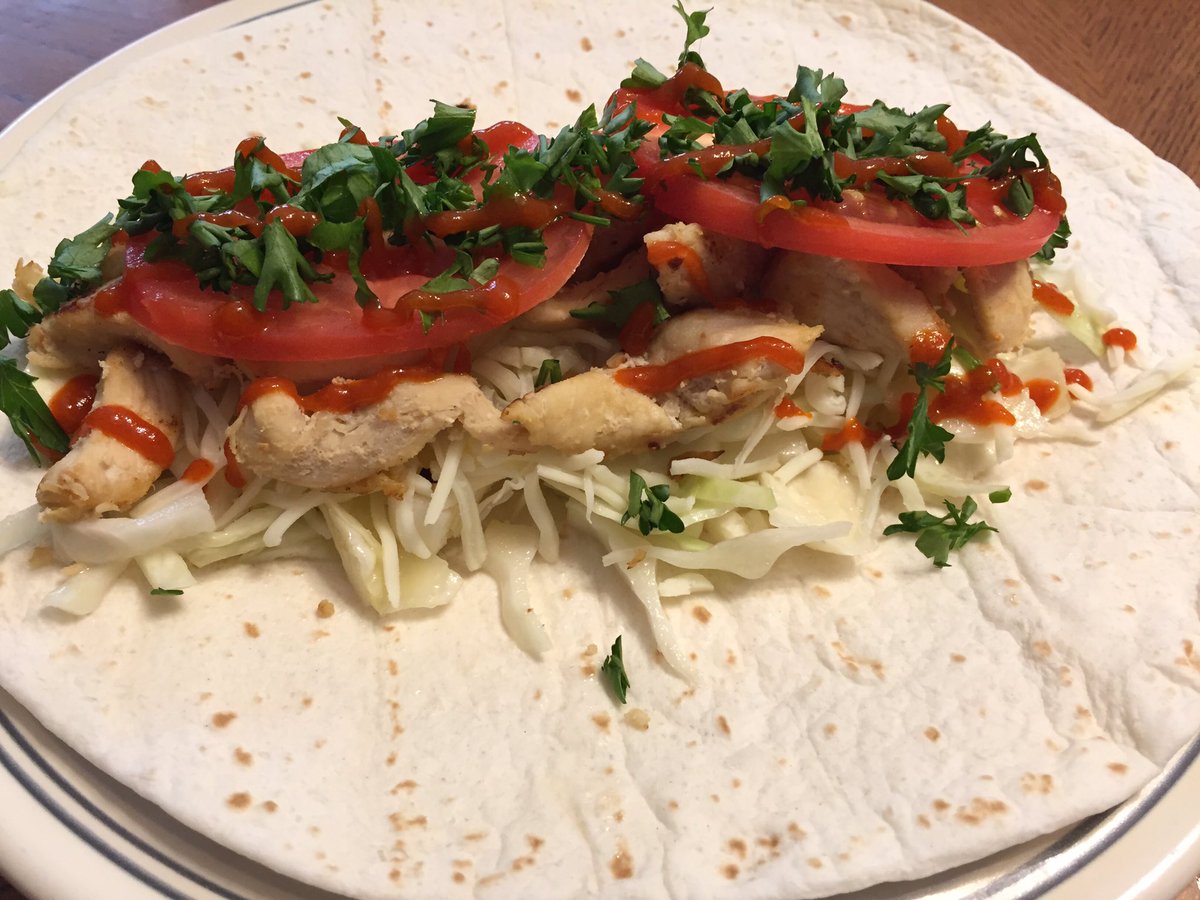 Chicken marinated 18 hours in orange juice, beer, and soy sauce and fried in butter and garlic. Shredded cabbage in vinegar. Sliced Roma tomatoes, mozzarella cheese, and shredded parsley topped with spicy sriracha sauce.pic.twitter.com/ZSvwS9ca2M