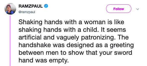 Oh my god, I just read this out loud and my boyfriend was like “I kinda understand that, it does feel weird to shake a woman’s hand. I don’t know why but it just feels weird. It’s kind a manly gesture” WHAT THE HECK?! I did not know this was even a thing!!!