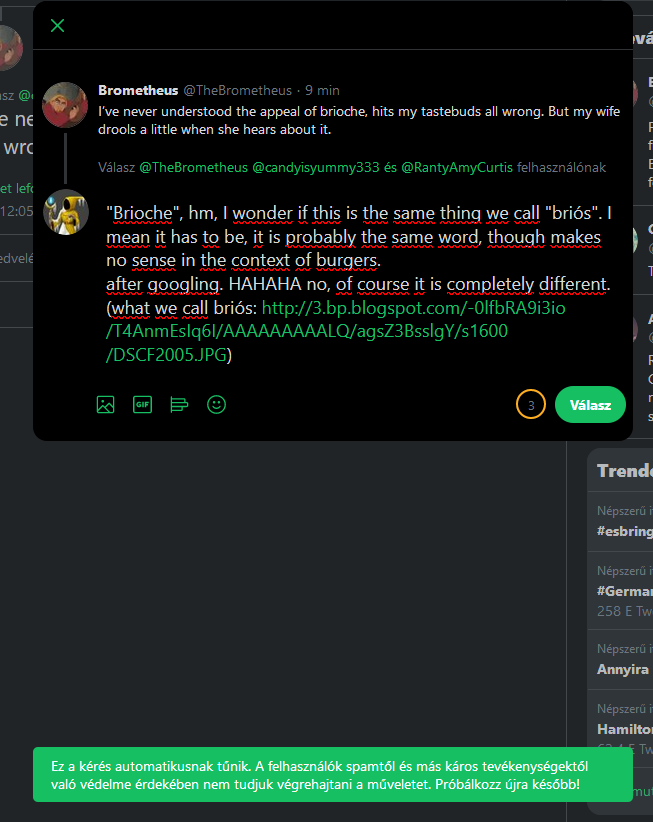 I just realized the error message is in Hungarian so no one is going to understand it. Basically it is telling me that I am not allowed to post that reply because it is spam.