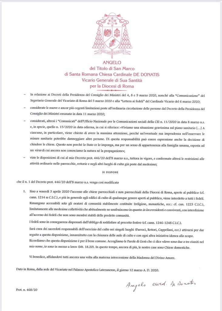 +++Sino a venerdì 3 aprile 2020 l’accesso agli edifici di culto di qualunque genere aperti al pubblico, viene interdetto a tutti i fedeli. I fedeli sono in conseguenza dispensati dall’obbligo di soddisfare al precetto festivo (cf. cann. 1246-1248 C.I.C.). pic.twitter.com/yl25kLRGwZ