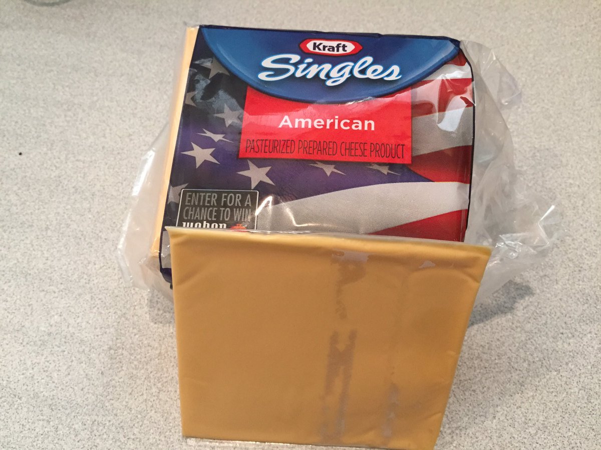 My European followers: Behold, American cheese-based food product. Each slice is individually wrapped and has the consistency of dense yellow clay. I’m pretty sure they’re infused with nutrients like zinc and boron. Americans try to get all our noble gases in each slice of cheesepic.twitter.com/e7zcwvKq5J