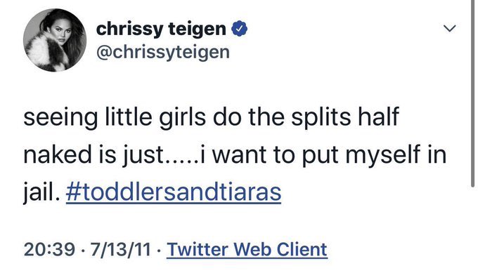 Y’all, @chrissyteigen has been lusting after little girls for at least 9 years now. I hope she’s never near a child ever again, and any child she’s ever been alone with unsupervised needs immediate assessment for abuse. This is SICKpic.twitter.com/H3mGjmJdaa