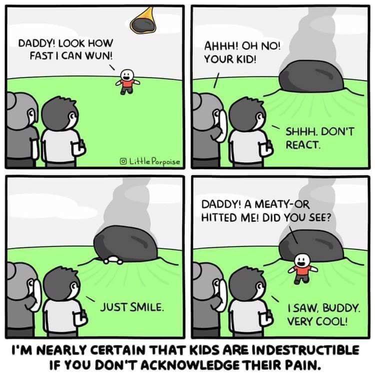Lol 100 percent true. By now my other kids cheer when a younger one gets hurt just to help them through the rebound
