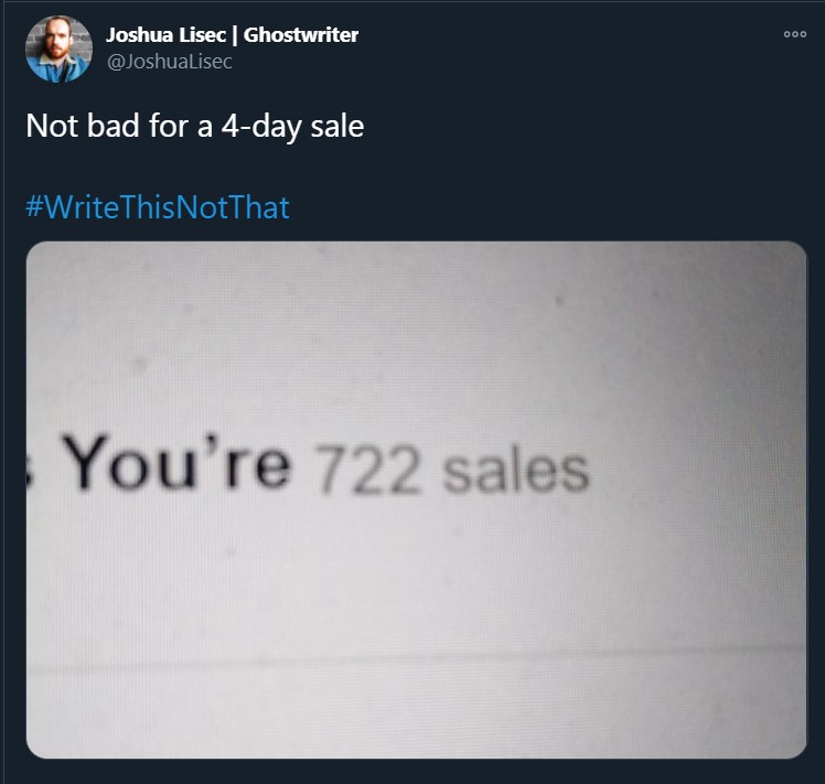 Most self-published books sell fewer than 100 copies in their LIFEtime. Write This Not That sold 722 copies in 4 days. Clearly I'm doing something differently — creating what people want to buy. Learn my ways thru @TheBrometheus's affiliate link. https://gumroad.com/a/324105331/OeoOW … pic.twitter.com/eR7KD7AJnE