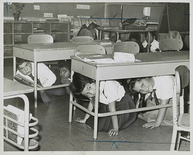1950s 2020s hiding under 2 masks will desk will save save you you from a from ViRuS nuclear explosionpic.twitter.com/FdVuX3NxM1