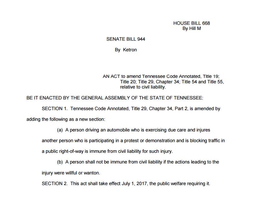 #Tennessee. Bill introduced in their state leg that gives drivers immunity from civil liability for hitting road blocking protesters.pic.twitter.com/Sri4MsbAR4
