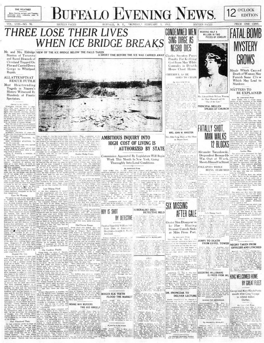 On Feb. 4, 1912, a Niagara Falls ice bridge cracks, and three are swept to their deaths. Read more about the tragic tale. http://bit.ly/2OpeDx3 pic.twitter.com/Vtvoe2x6GL