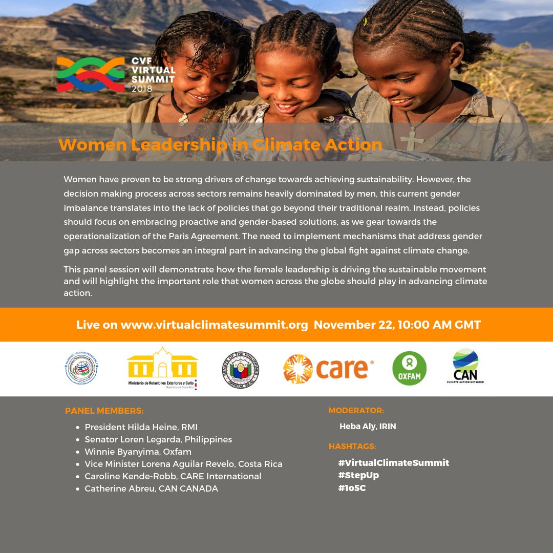 Women have played a vital role in propelling Climate Action into the spotlight. As Chair of @TheCVF @President_Heine will lead our thematic panel on Women Leadership in Climate Action alongside @loren_legarda @Winnie_Byanyima @CarolineKende @cat_abreu @Oxfam @CAREClimatepic.twitter.com/56l2avpPIL