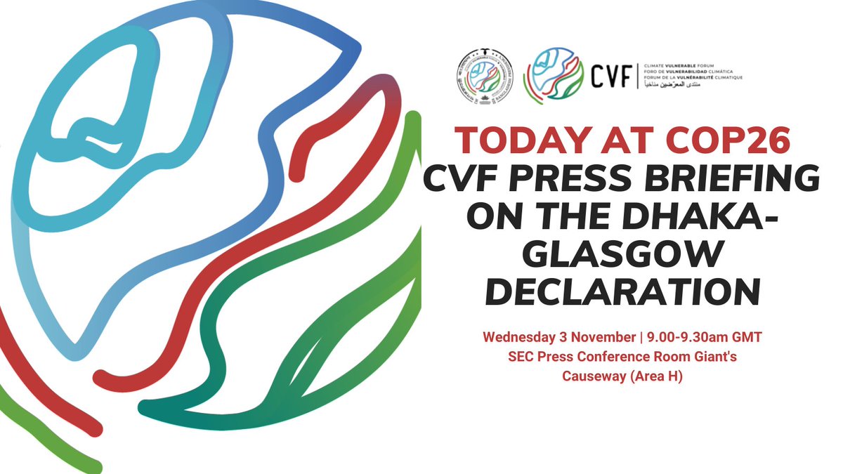 MEDIA ADVISORY: The CVF invites @COP26 press to join us for a briefing on the Dhaka-Glasgow Declaration adopted by more than 50 CVF Member States on Tuesday at #COP26.