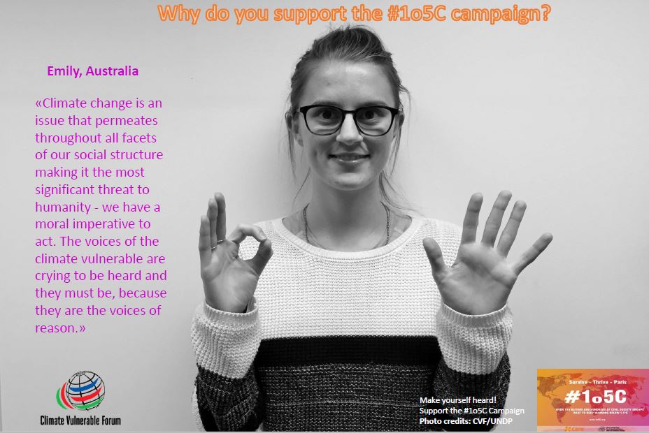 Emily #COY11 participant lifting the youth voice for the #CVF #1o5C campaign for #COP21 http://thecvf.org/ pic.twitter.com/GV7d2VRSkJ