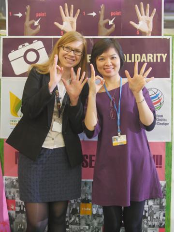 Quyen Vo & Viivi from #Finland put hands up in the air for #1o5C with @TheCVF http://1o5C.org #COP21pic.twitter.com/MU2fzsoiSS