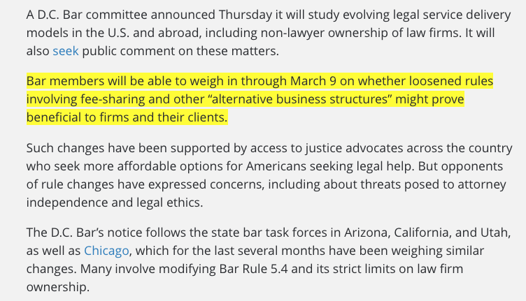 @DC_Bar is the latest Bar Association considering relaxing rules around fee-sharing and alternative business structures (i.e. - allow non-lawyers to have equity in law firms).#lawtwitter https://news.bloomberglaw.com/business-and-practice/d-c-latest-jurisdiction-to-mull-law-firm-ownership-rule-changes?context=search&index=4 …pic.twitter.com/GKT2NBpakO