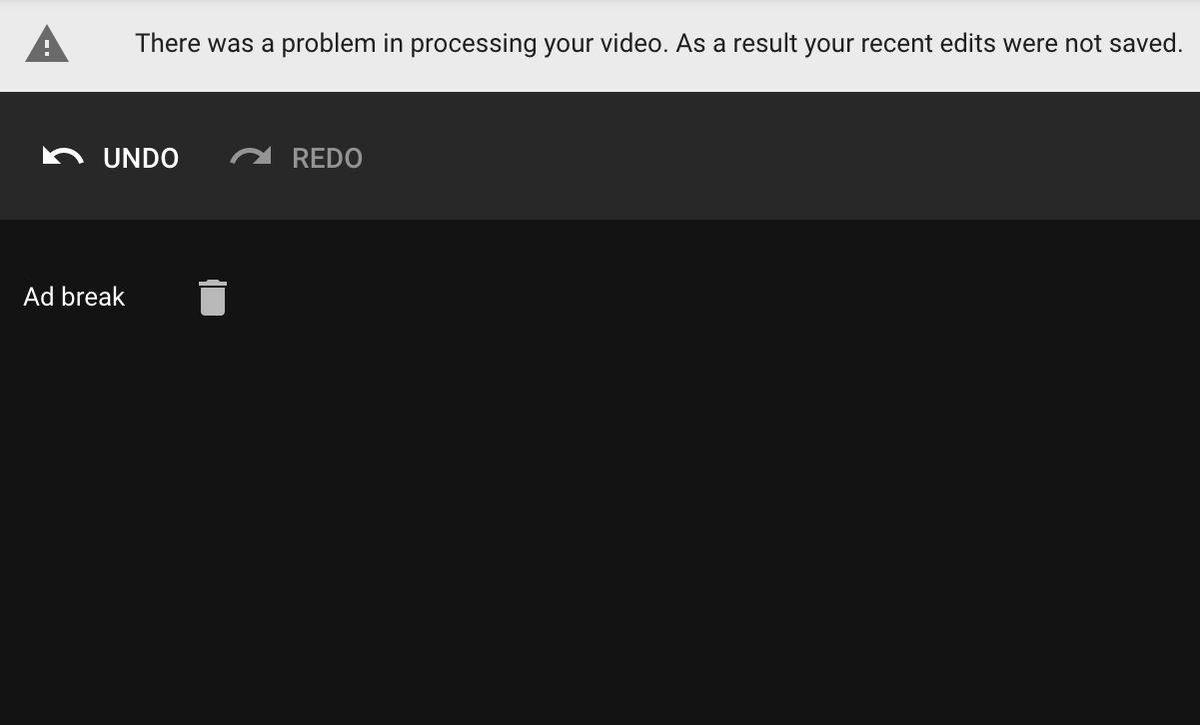 @TeamYouTube hey friends. I had an issue with one of my newest uploads. The video processed fine, & has a green icon, but when I try to add mid roll ads it says “there was a problem in processing your video. As a result recent edits were not saved”. Any help is appreciated.pic.twitter.com/flK1DOXiAI