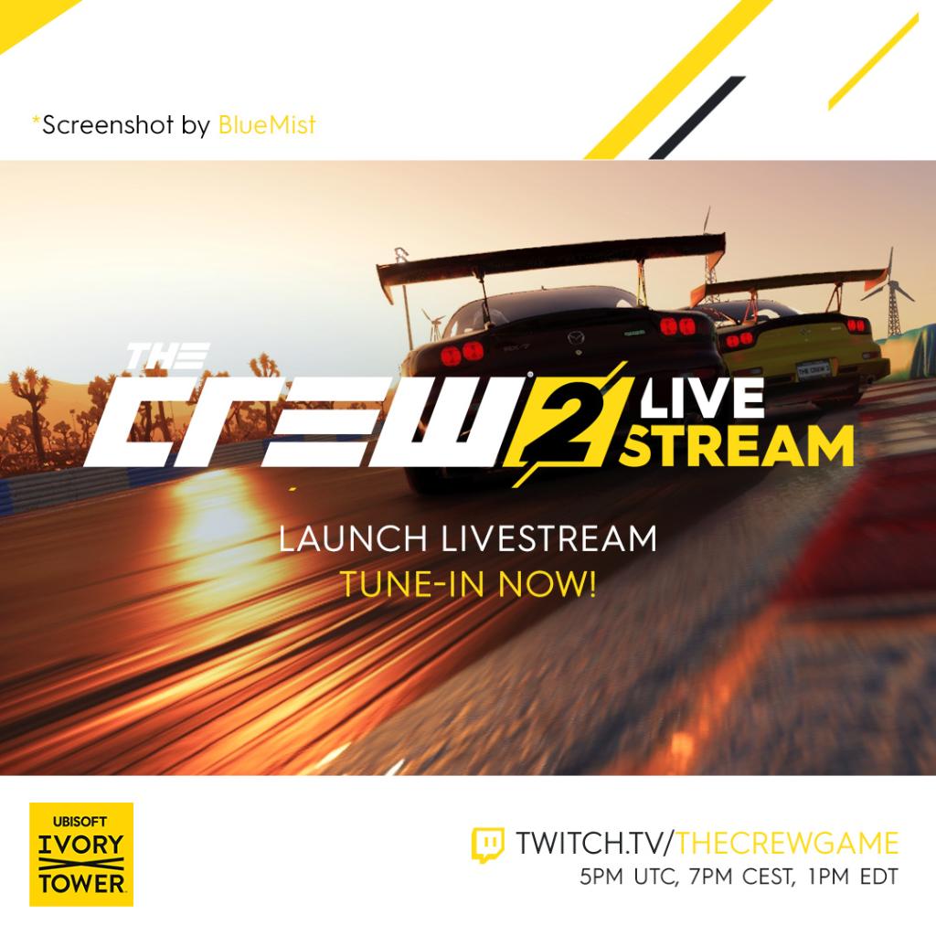 #TheCrew2 launch stream is now live! Tune in here: http://www.twitch.tv/thecrewgame pic.twitter.com/2k1rXXw7ue