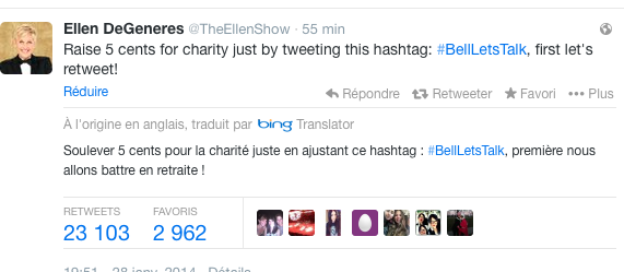 @TheEllenShow: Raise 5 cents for charity just by tweeting this hashtag:#BellLetsTalk, first let's retweet!” Même Ellen!!!!!! -