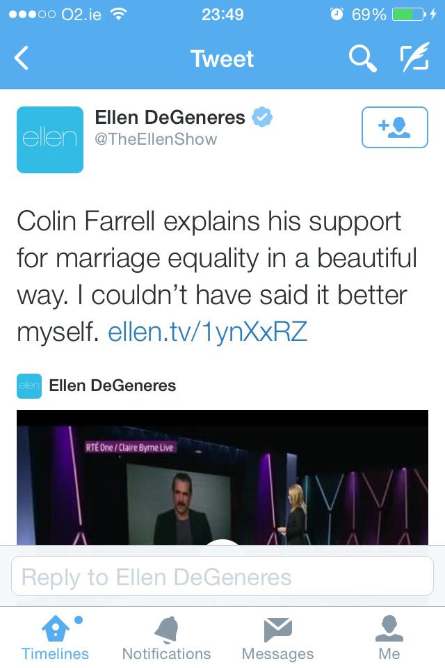 @TheEllenShow "Farrell explains his support for marriage equality in a beautiful way. Icouldn’t have said it better myself.@ClaireByrneLiveThanks. Twitter will use this to make your timeline better. UndoUndo