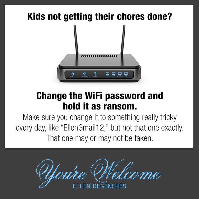 @TheEllenShow Or just change the name of the Wifi name of what you want them to do - "Clean Your Room" - the new name of wifi at my house!Thanks. Twitter will use this to make your timeline better. UndoUndo