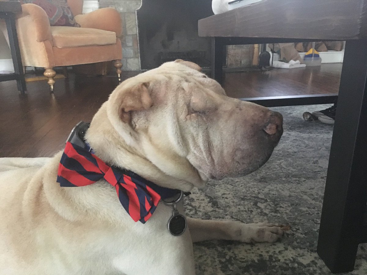 #4ellen Dimitri the no eyed wonder pup enjoyed being taste tester of pumpkin pie. And yes, he's wearing A bow tiepic.twitter.com/HxfpyrUAGw