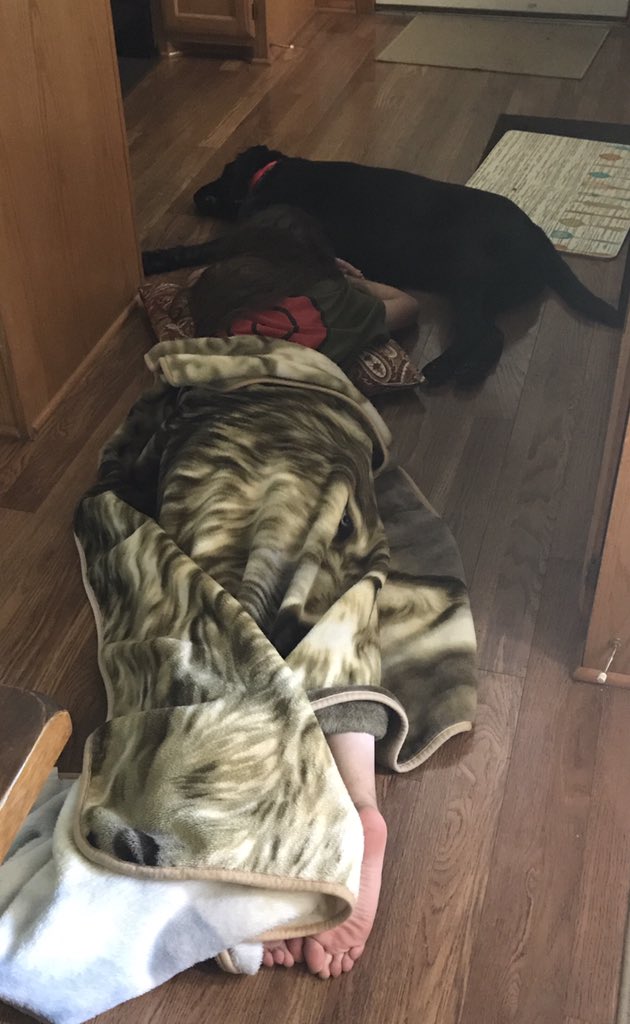This is our daughter Sarah comforting our scared dog, Kelly, who had been missing for more than 24 hrs. We had a happy girl & happy dog.