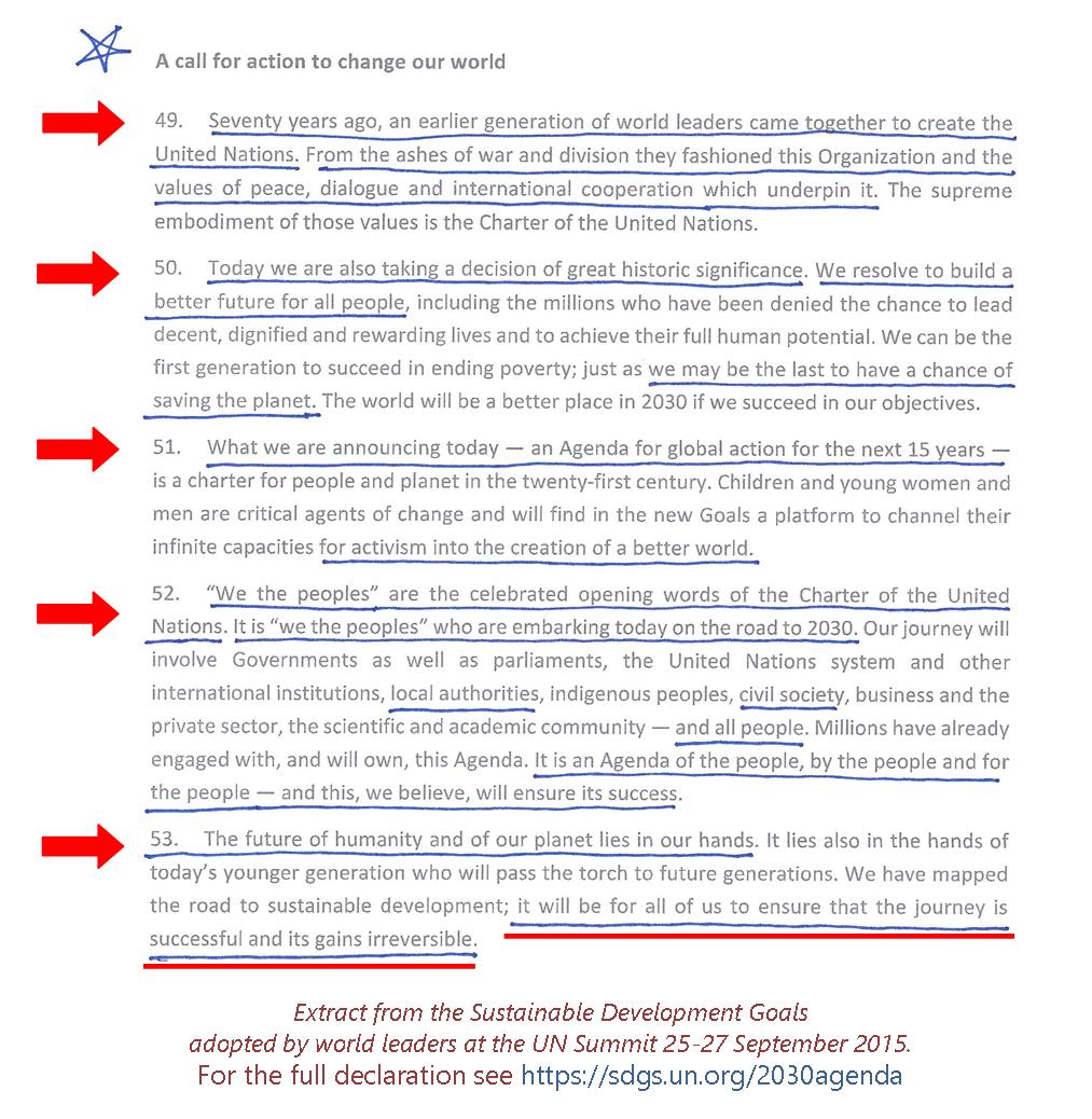 September 2015 '51. "We The Peoples" are the celebrated words of the Charter of the United Nations. It is "We The Peoples" who are embarking today on the road to 2030 53. The future of humanity and of our planet lies in our hands.'