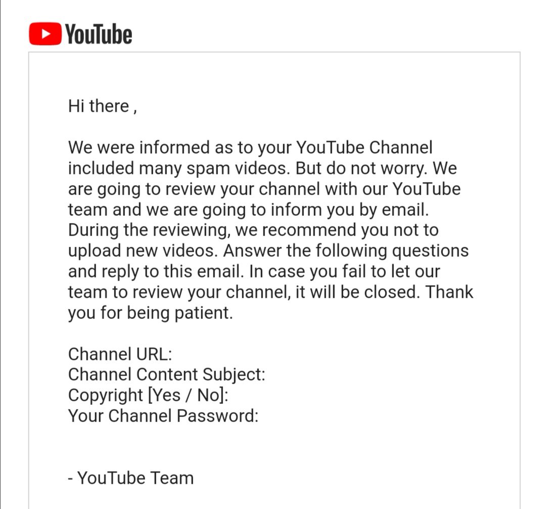 Just received this clearly a scam email supposedly from @TeamYouTube if you receive this email DO NOT GIVE THEM ANY INFORMATION!! If you fall for it you could get your channel hacked into and even deleted. Youtube wouldn't ask for your personal information so don't fall for thispic.twitter.com/A9idmo3xKo