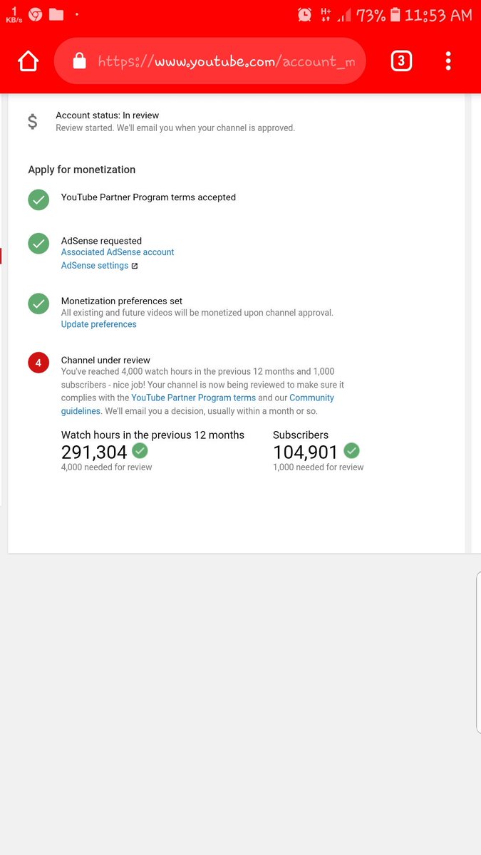 @TeamYouTube Hello TeamYouTube my channel cross 291304 Watchtime and 104+k subscribers please review my channel and Approved Monetization quickly  as well as possible.I am waiting before 8 months. My Channel URL: https://www.youtube.com/channel/UCKUrVaZGumtx3cE2lT63QGw … Thanks YouTube Team.pic.twitter.com/6VulSjE5xG