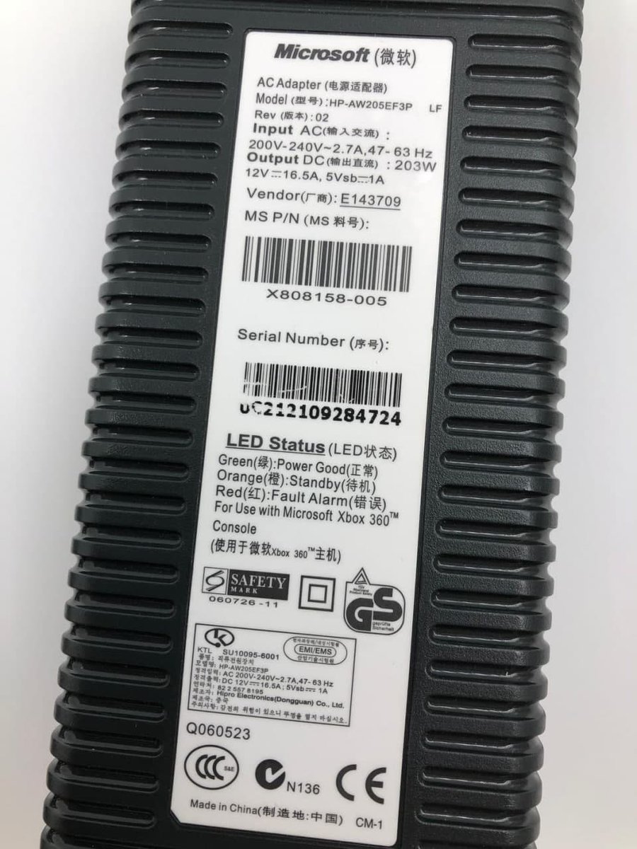 Question for the Microsoft/X360 experts, does this look like a legit 203W EU-region power brick? The label looks alright, but the lack of keying on the connector seems suspicious. I'm using this to power up a devkit, so I don't want to dump Chinesium into it.pic.twitter.com/PSjTrTZq7B