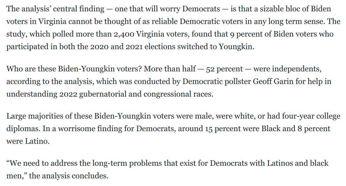 NEWS: A new analysis of the VA loss circulating among Dem officials warns that the "Biden-Youngkin voter" could be a real problem for Dems in other 2022 races. It finds a nontrivial subset of Biden backers are *not* reliable Dem voters. Details here:https://www.washingtonpost.com/opinions/2021/12/22/analysis-of-virginia-loss-democrats-2022/ …