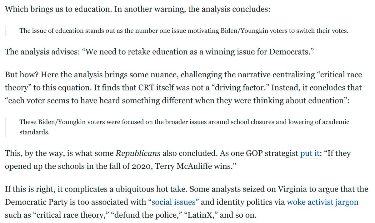 Key finding: The leading issue for Biden-Youngkin voters is education. But the analysis offers a more nuanced understanding of the problem than we get from all the fingerpointing at "wokeness." There is another approach. w/links to