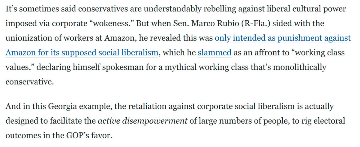 It's easy to mock corporate "wokeness." But it actually has its place in helping facilitate political change. And in this case, what's being exposed is the sheer hollowness of GOP screams about this kind of "liberal cultural power": https://www.washingtonpost.com/opinions/2021/04/01/gop-war-on-voting-georgia-delta/ …pic.twitter.com/W7xXJINo9a