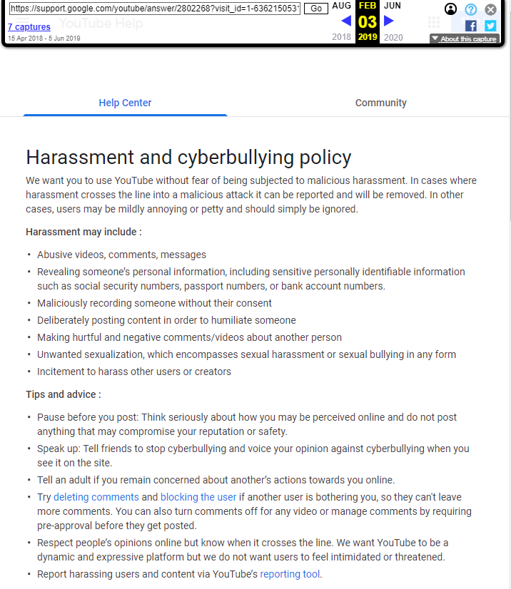 @TeamYouTube Question, I am trying to finger out when did you change your harassment policy on the website. Can you tell me the date when you change these policies? https://support.google.com/youtube/answer/2802268?visit_id=1-636215053151010017-1930197662&rd=1&hl=en#contact=1 …pic.twitter.com/OgTQRCk2Al