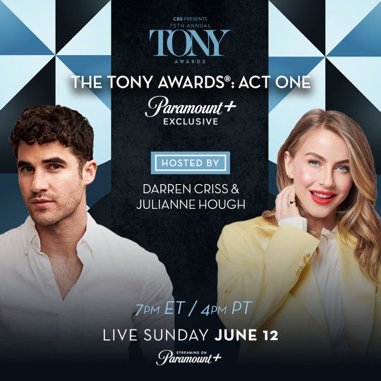 @juliannehough and I are hosting “The Tony Awards: Act One” 6/12 at 7pm ET/4pm PT. I know you’re thinking DARREN WHAT DOES THAT EVEN MEEEAAAAANNN well you can check it out on@paramountplus before@TheTonyAwards live show on@CBS to find out!pic.twitter.com/Hgq06izciw