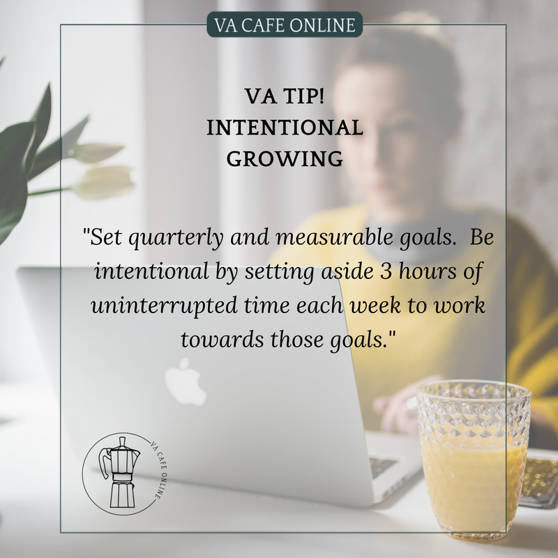 VA Tip - Set Quarterly and Measurable Goals. Be intentional by setting aside 3 hours of uninterrupted time each week to work towards these goals. (Tip and Image by Natalie Lynn