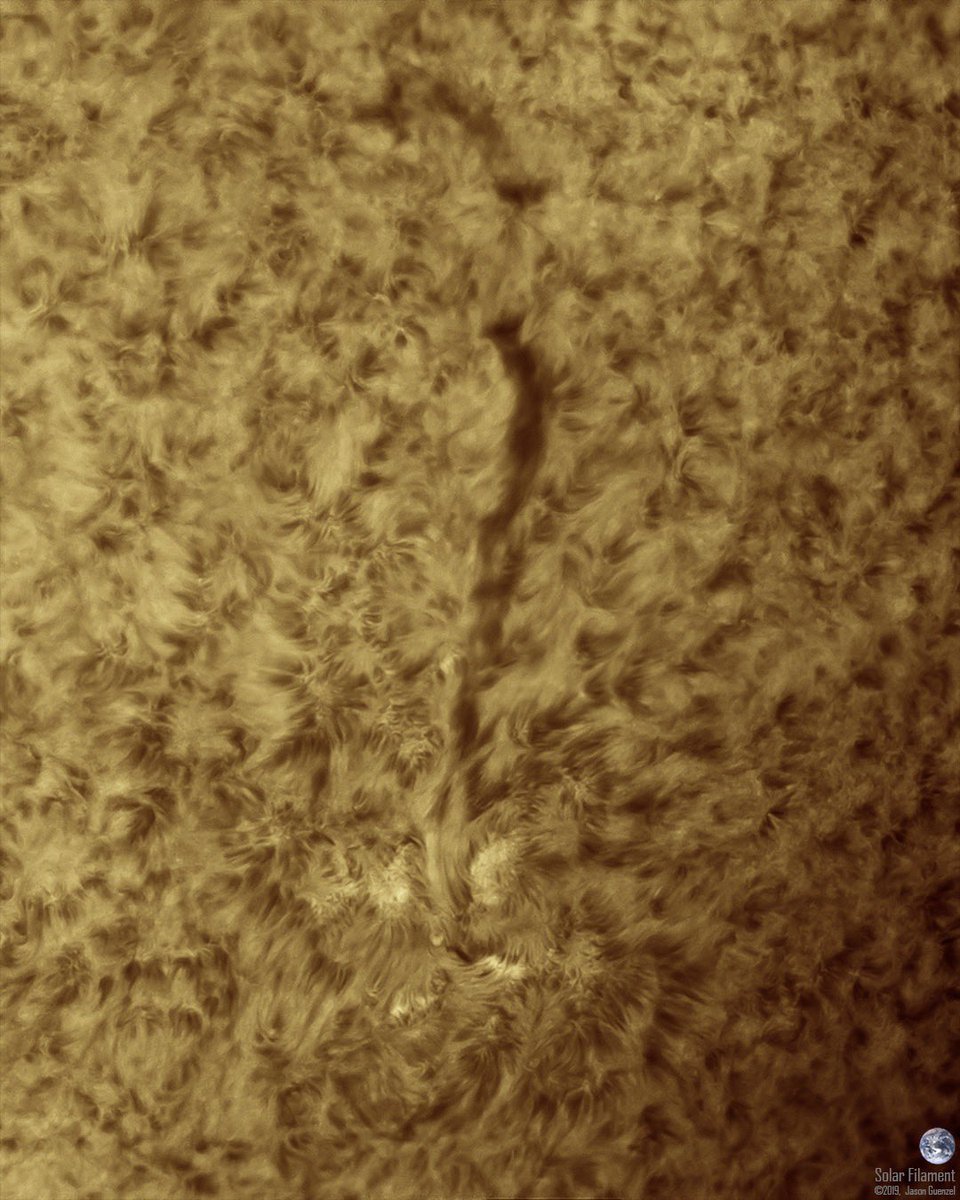 #solar#filament from 22-FEB-2019. A filament is just a#prominence that is backlit by the brighter atmosphere of the#sun. This view showcases the#hydrogen gas floating in the#chromosphere. Earth added for scale!