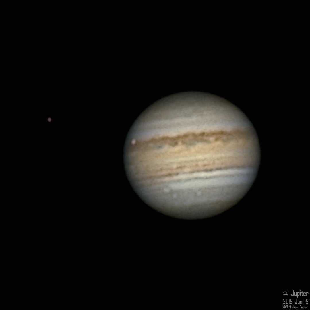 #Jupiter from 19-Jun-2019. The#moons#Ganymede (to the left) and#Io (over the limb of the#planet) slowly glide in their orbit. Watching these changes in real-time is a major draw to#planetary#imaging. Hopefully a video next time!#astrophotographypic.twitter.com/oMT7fuyOx1