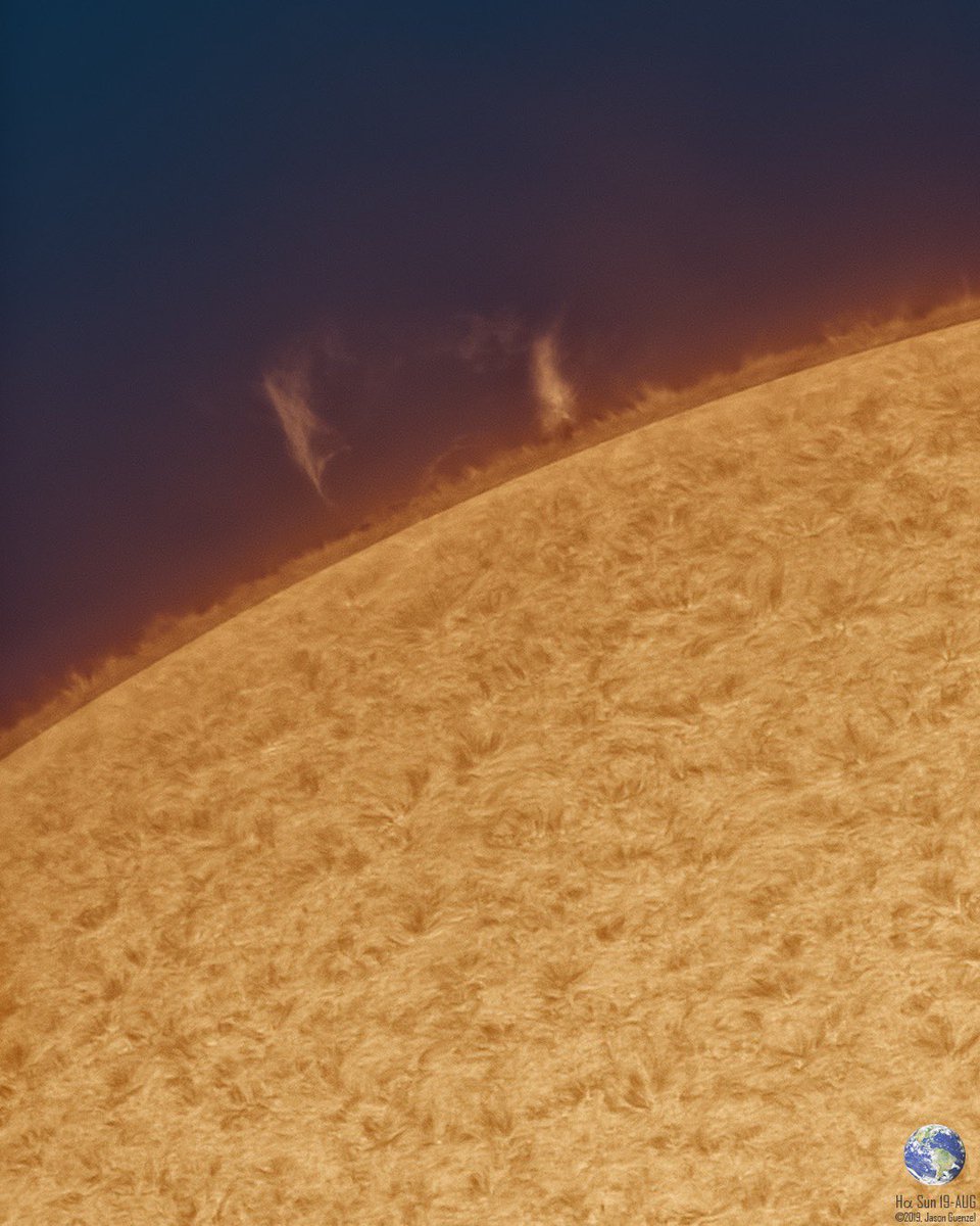 #Sun from Aug 19, 2019. The#solar activity is very low right now, so bright#prominences can be rare. The#Earth is shown as a scale reference at the bottom. Prom towers 3 Earth diameters above the surface!