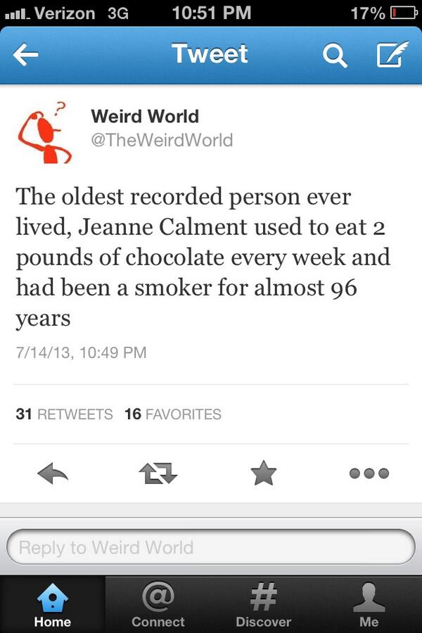 @TheWeirdWorld I met an old lady when I was about 12 that was a 101 years old. But she wasn't a smokerThanks. Twitter will use this to make your timeline better. UndoUndo
