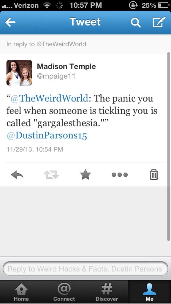 @TheWeirdWorld: The panic you feel when someone is tickling you is called "gargalesthesia."”Thanks. Twitter will use this to make your timeline better. UndoUndo
