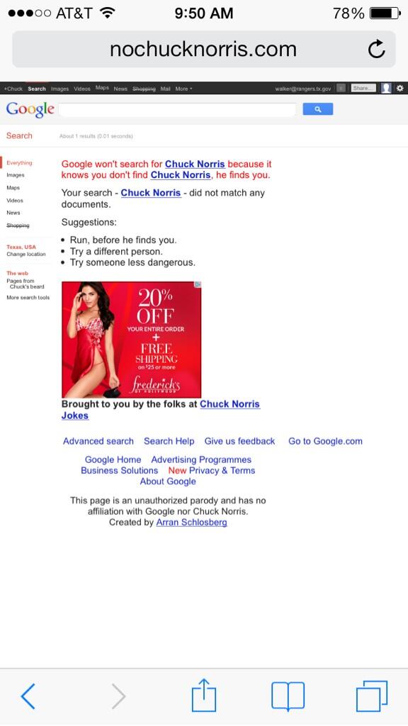 @TheWeirdWorld Google won't search for Chuck Norris because it knows you don't find Chuck Norris, he finds you.