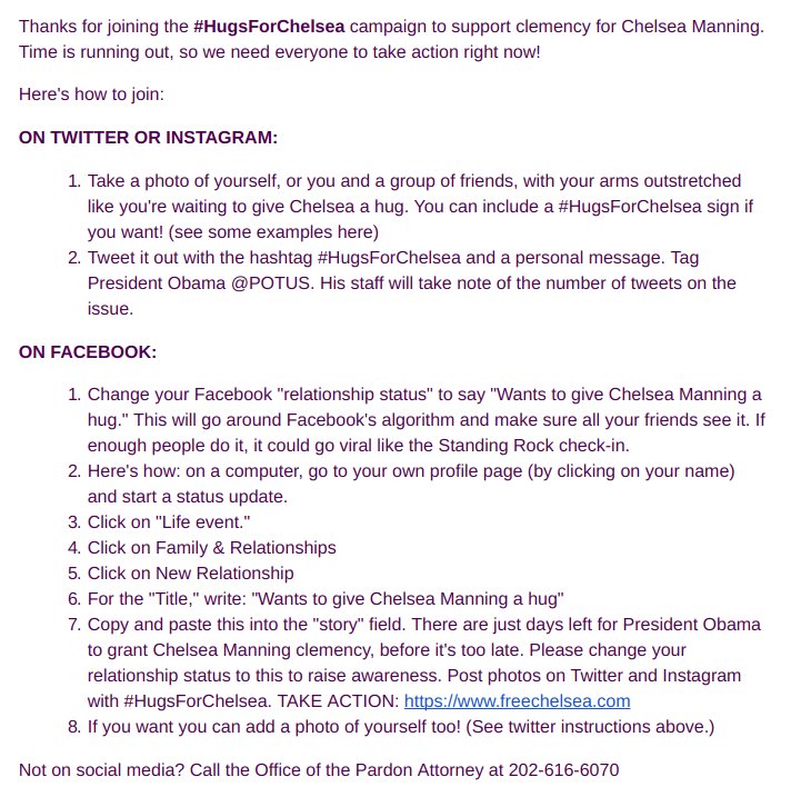 #HugsForChelsea campaign to tell@POTUS#FreeChelseaNOW https://actionnetwork.org/petitions/hugsforchelsea-give-chelsea-manning-a-hug/ … pic.twitter.com/L3qVi52dEQ@IDLtweets