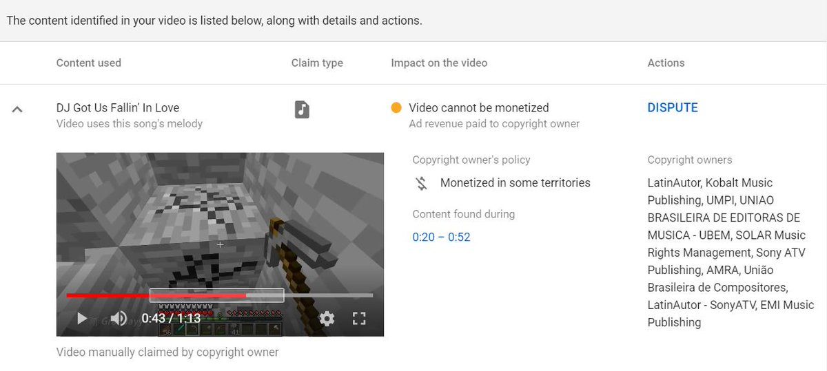 The publishers of DJ Got Us Falling In Love just copyright claimed my "I changed Minecraft's sounds to Creeper Aww Man lyrics" video https://www.youtube.com/watch?v=CcpuwKobosw …pic.twitter.com/ponaLlVuto